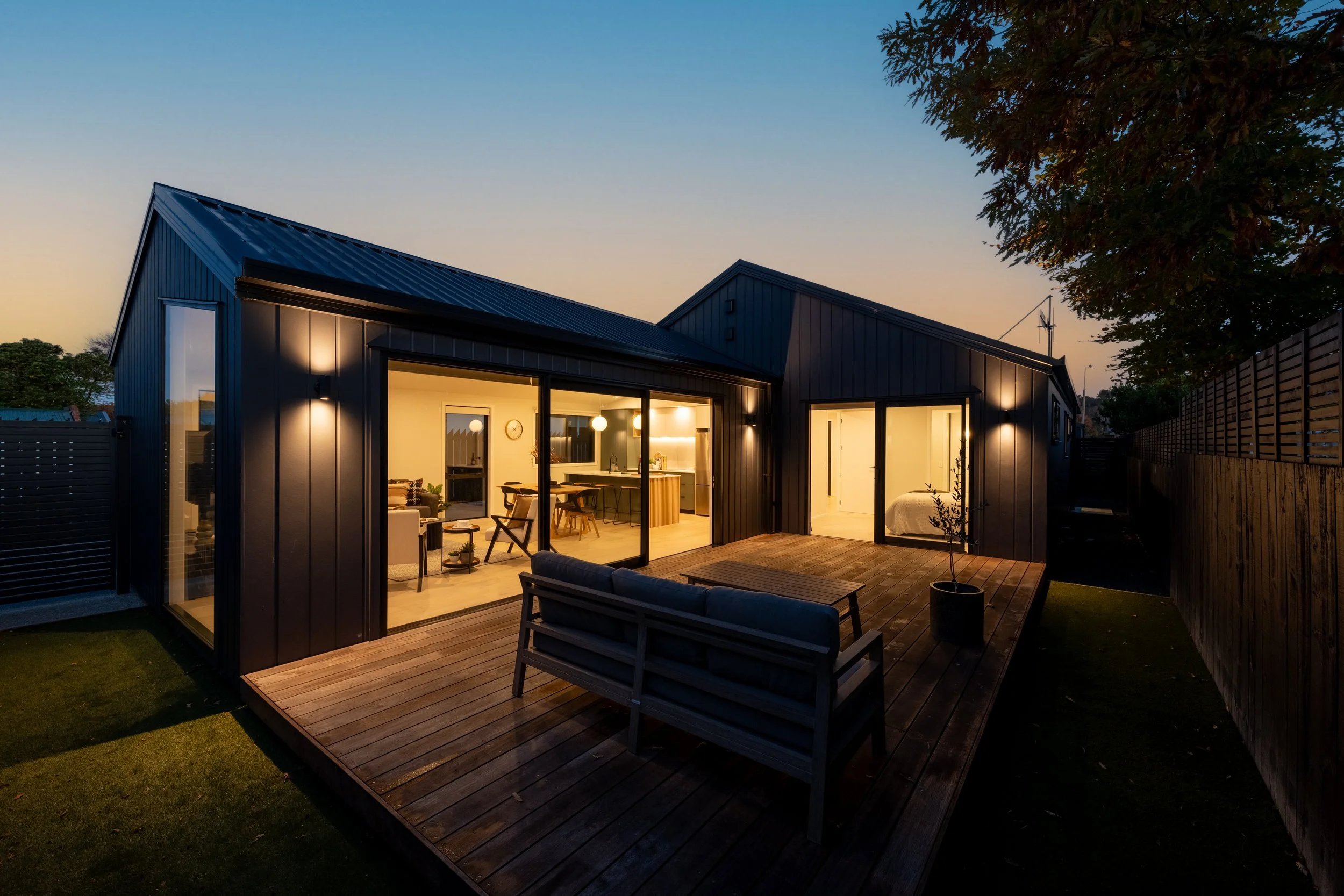 Positioned between two companion dwellings, this home forms part of a cohesive trio designed to sit comfortably within the established Gladstone neighbourhood. A simple gabled form and vertical cladding create a calm architectural language, while the layout prioritises privacy and connection to outdoor living. The open-plan kitchen, dining and living area forms the heart of the home, extending to a sheltered deck and garden. Bedrooms are arranged along the quieter side of the plan, creating separation from the main living spaces while maintaining a compact and efficient footprint.