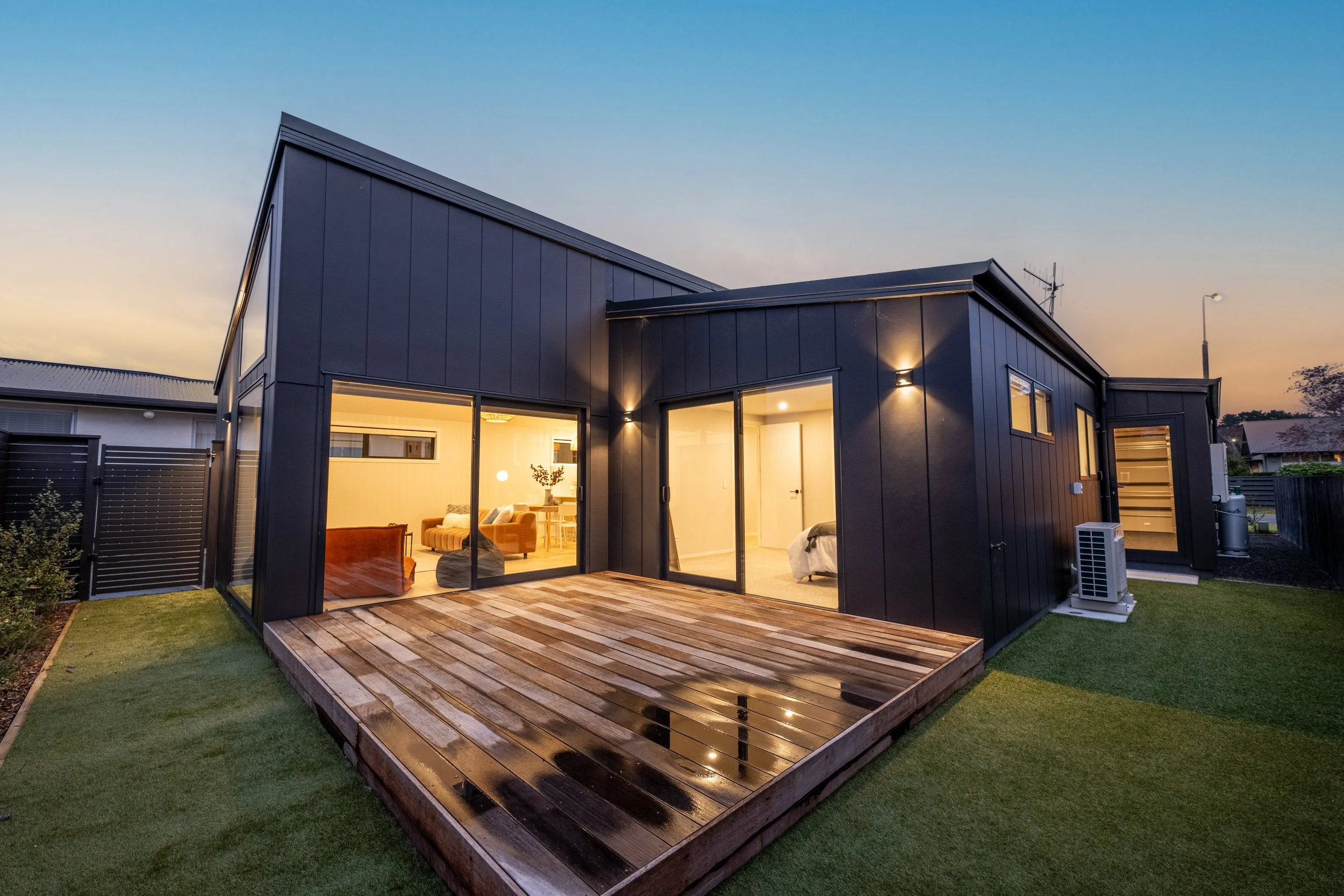 Located in Gladstone, Invercargill, this home forms part of a thoughtfully designed trio of dwellings on a subdivided urban site. Positioned closest to the street, the house establishes a strong presence through its simple monopitch form and dark vertical cladding. The layout is centred around a sheltered courtyard and deck, allowing the living spaces to open outdoors while maintaining privacy from neighbouring homes. Inside, a light and warm interior palette contrasts the bold exterior, creating a contemporary home that feels both refined and comfortable.